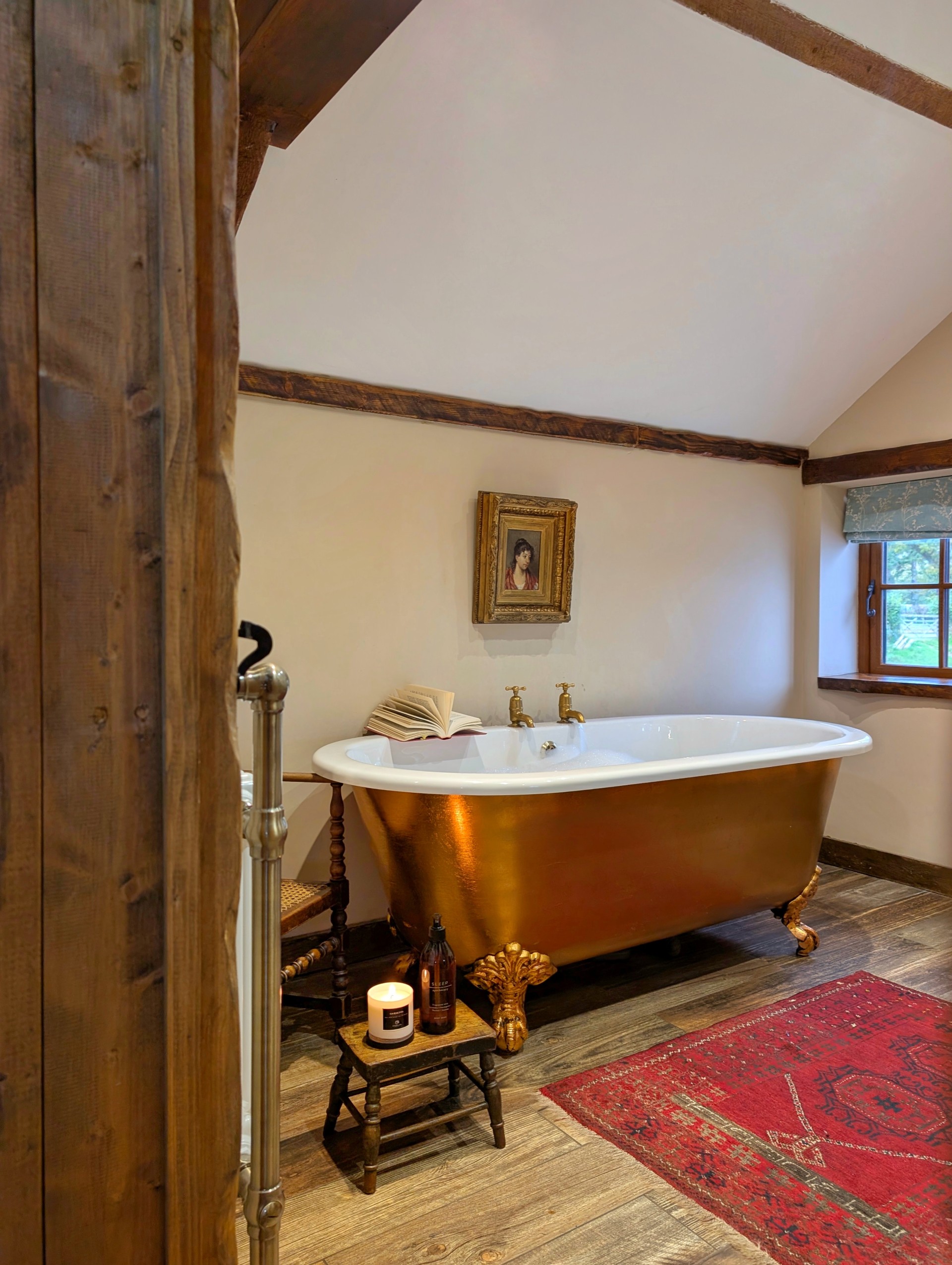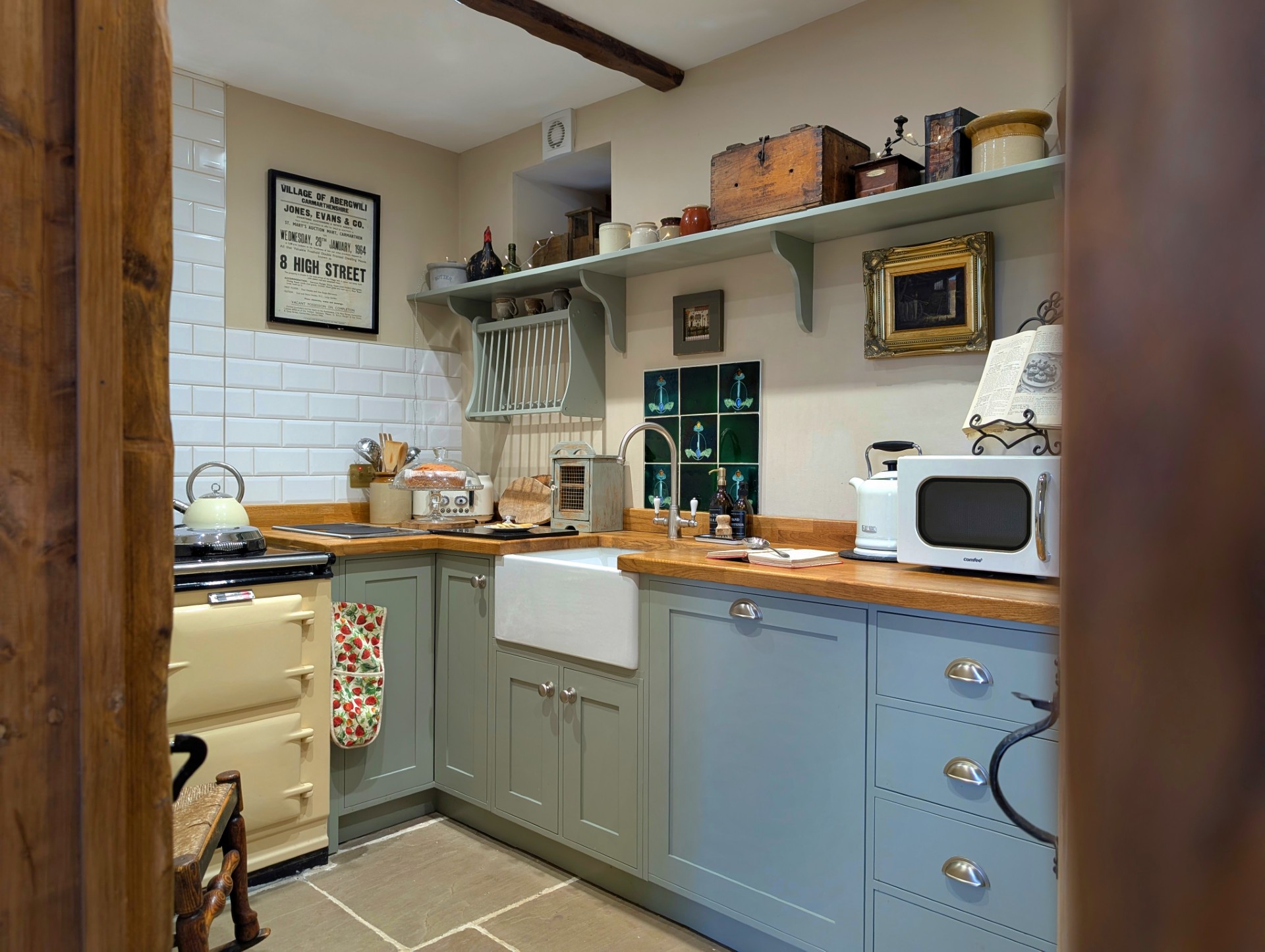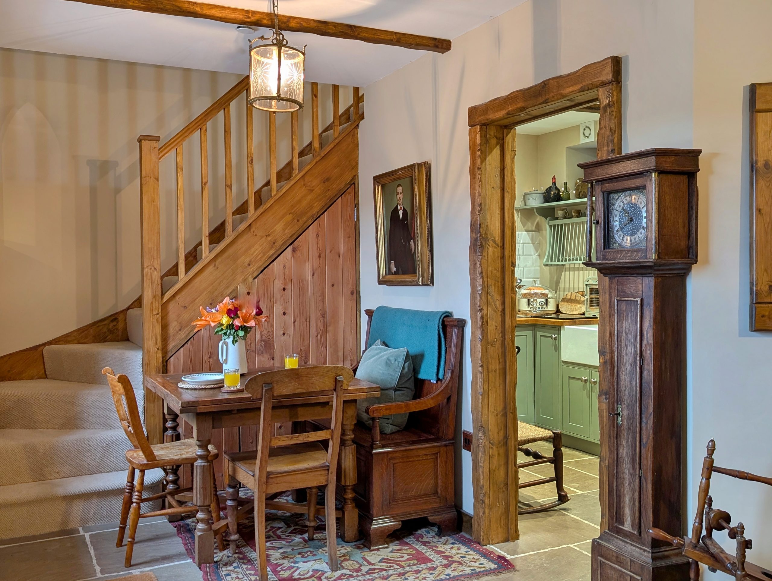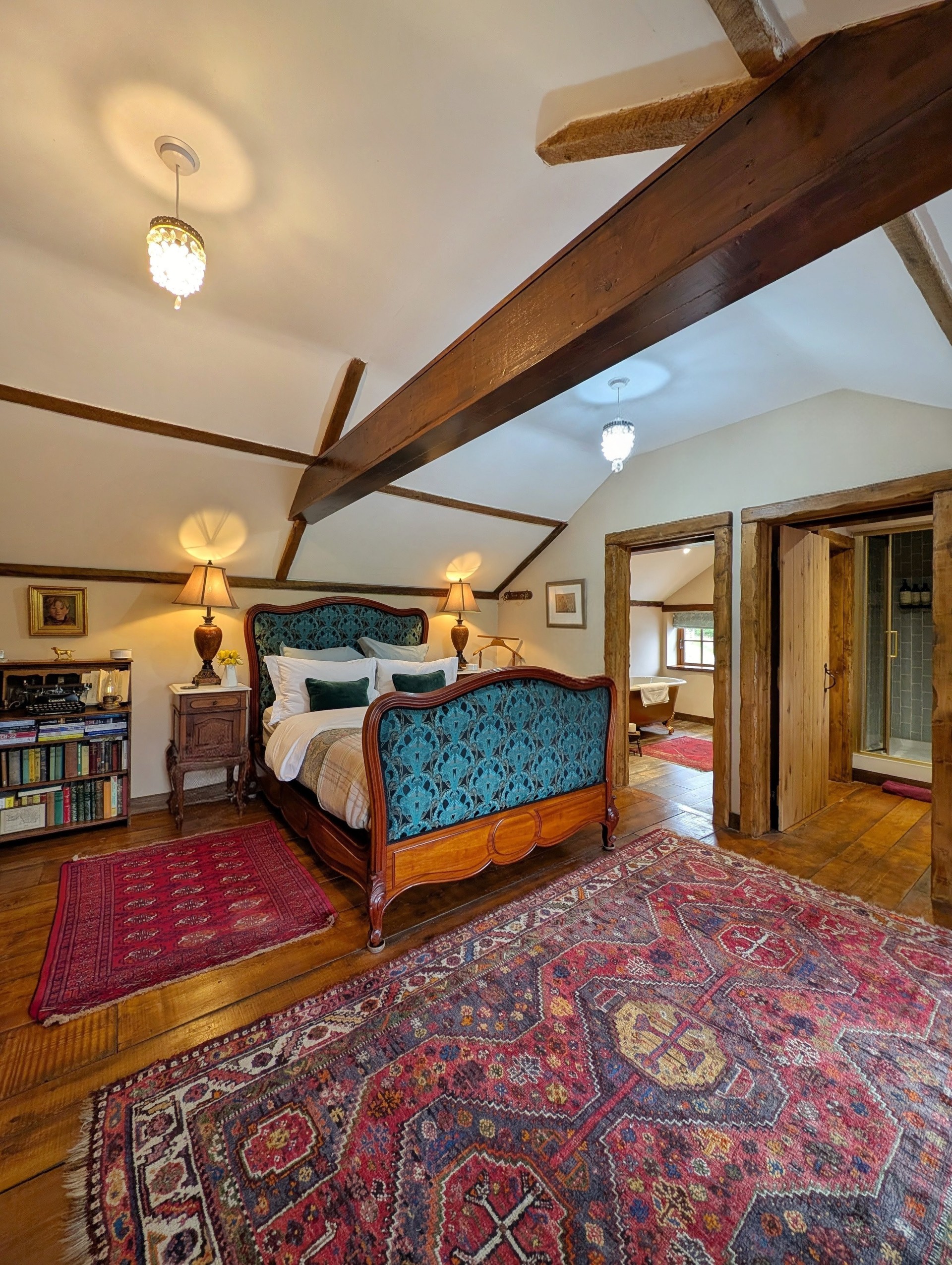 Y tu mewn, mae lolfa gartrefol gyda thân coed traddodiadol, trawstiau gwreiddiol a soffa Chesterfield – man delfrydol i ymlacio ar ôl diwrnod o archwilio. Mae’r gegin grefftwaith yn cynnwys Aga a pheiriannau modern, gan uno dyluniad gwledig â chyfleustra cyfoes. Ar y llawr uchaf, mae’r brif ystafell wely yn cynnwys gwely Ffrengig hynafol, gyda bath slipiwr moethus a dodrefn cain sy’n dathlu hanes y tŷ.