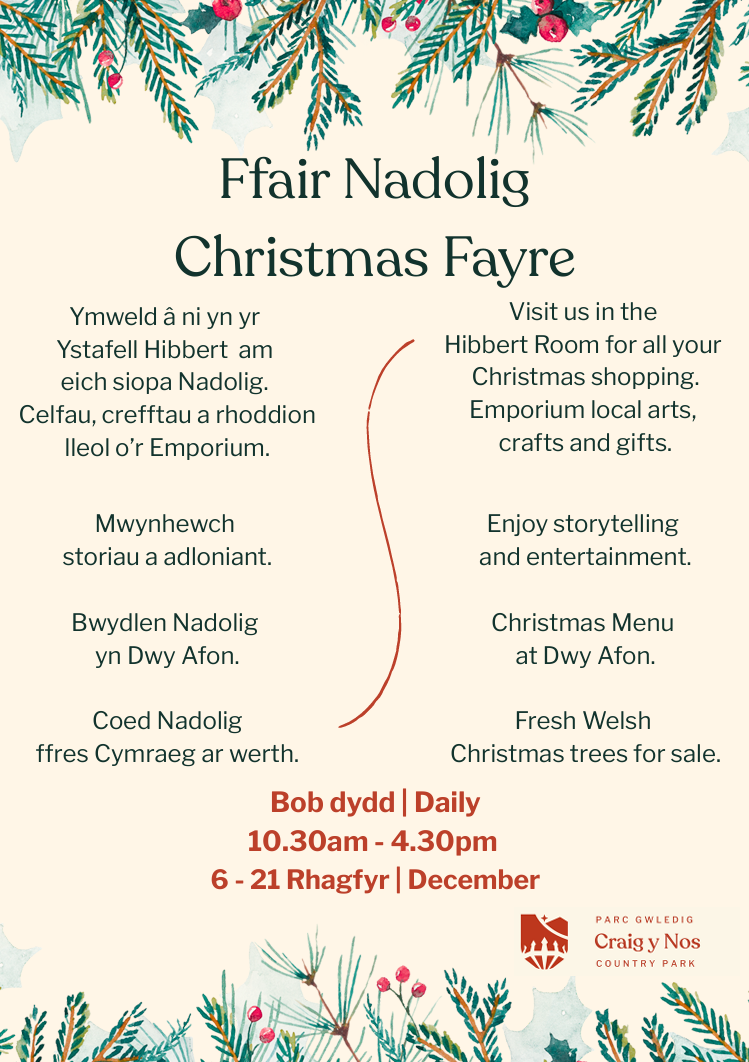 From 6–21 December, visit the Hibbert Room daily (10.30am–4.30pm) for the Craig y Nos Country Park Christmas Fayre. Browse local arts, crafts and gifts from the Emporium, listen to storytelling and entertainment, enjoy a festive menu at Dwy Afon, and pick up a fresh Welsh Christmas tree to take home.